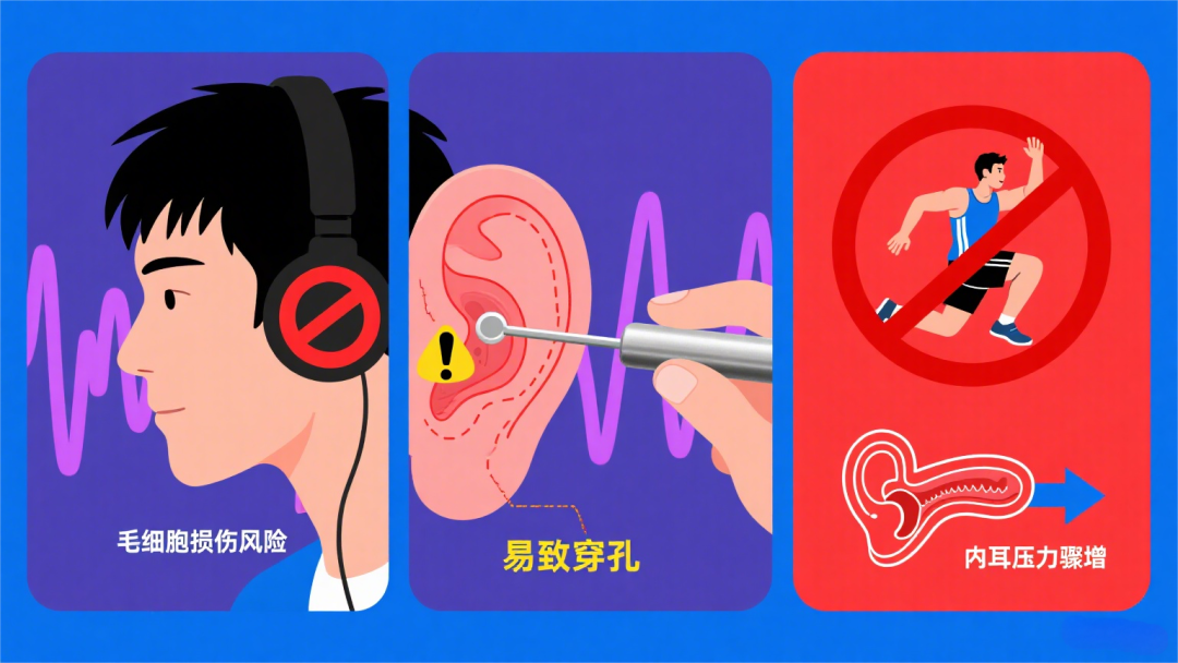 1.立即停止:戴耳机、掏耳朵、剧烈运动