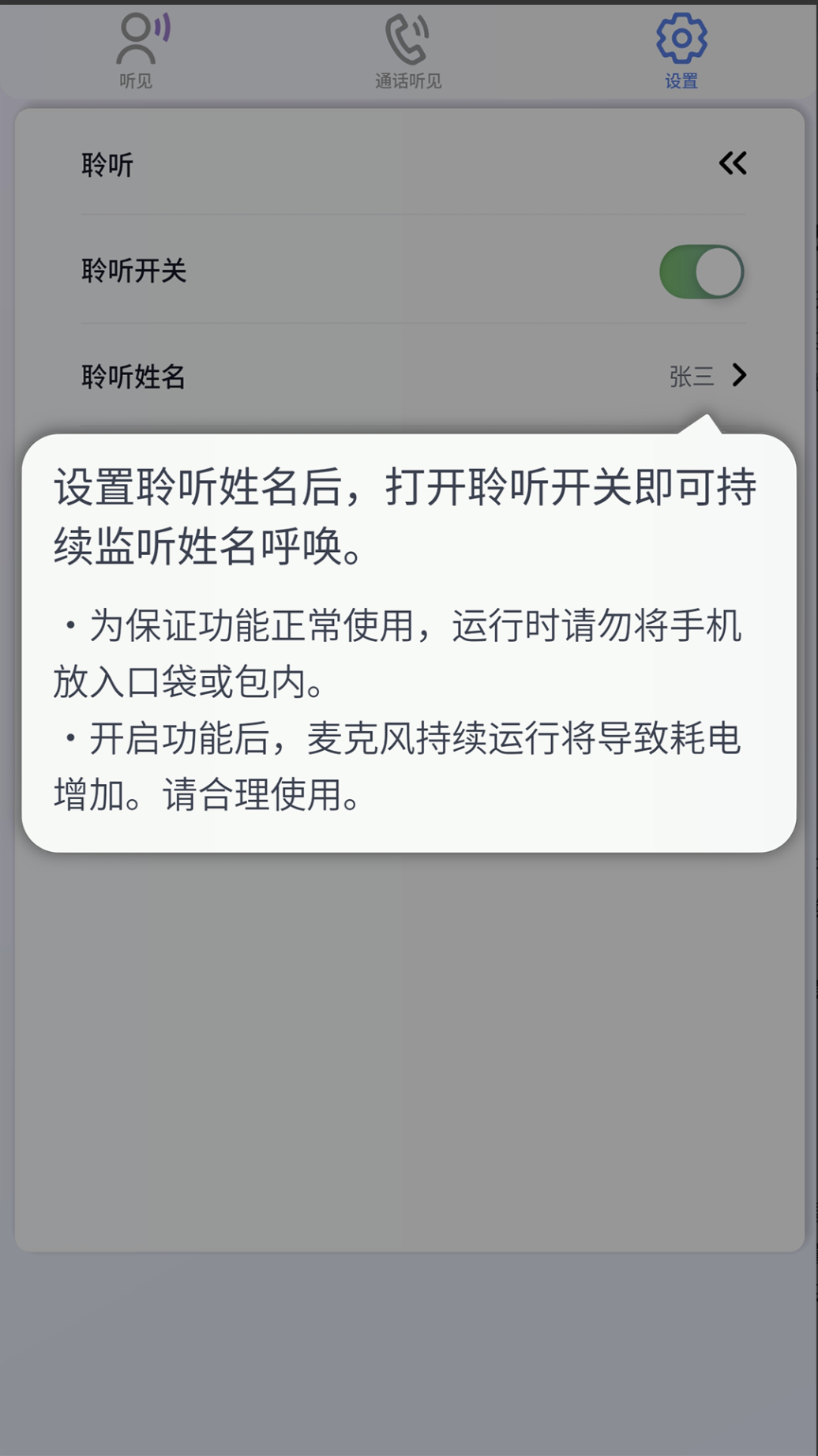 用户可自定义多个姓名进行监听,开启后,听见 APP 会实时检测是否有人呼唤姓名,当有姓名呼唤时,会通过振动和弹窗提醒来帮助用户及时感知呼唤。聆听功能还支持灵敏度调节和自定义振动提醒时长设置。开启聆听后,APP 主界面与悬浮窗的听见图标颜色将发生变化,以指示聆听状态。这项贴心设计让听障朋友不再担心错过别人的呼唤,真正做到“让姓名可以被听见与看见”。同时,听见 APP 采用智能低负荷模型,更加省电,相较其他音频监听工具更适合长时间运行。