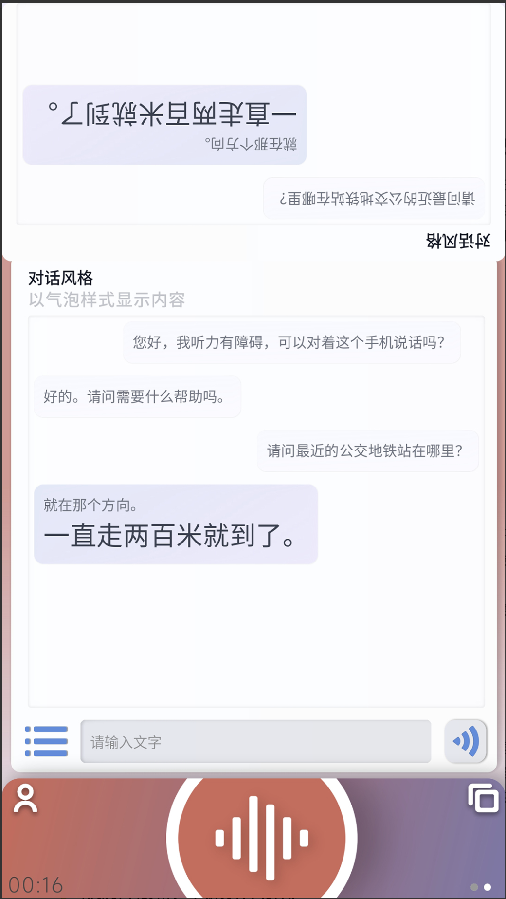 双向展示语音识别与文字转语音内容的镜像模式,专为面对面沟通场景设计。无论是工作交流还是日常对话,都能让双方同时看到语音转文字与文字转语音的实时内容,减少语音转文字中的误差和歧义,让沟通更加高效便捷。同时,镜像区的高度与字体大小还支持在设置中动态调整。